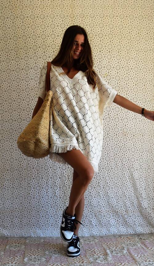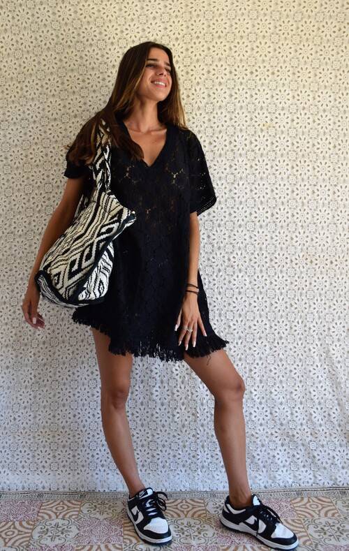 Se porte avec de jolies spartiates ou encore avec des baskets pour un look décontracté à souhait. Soyez chic et élégante pour vos sorties plage ou en ville en Guyane ! Avec cette belle tunique beachwear ajourée en coton pour en faire une pièce tendance. Déclinée en deux coloris écru et noir et 4 tailles disponibles S, M, L et XL.